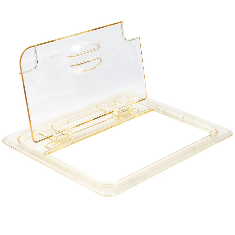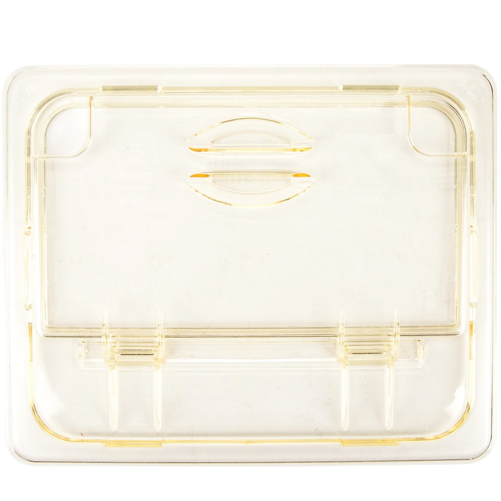 This amber Cambro 20HPLN150 H-Pan: 1/2 size high heat notched FlipLid food pan lid is designed to flip upward to allow easy access to contents. It’s perfect for holding high heat and freezing foods in any commercial kitchen. It’s built with strong, durable materials to withstand extreme temperatures from -40 to 375 degrees Fahrenheit and will help maintain your food’s temperature after it’s taken out of the oven or freezer. To aid in storage and transport, this flat cover conveniently stacks with similar items to create more usable space.